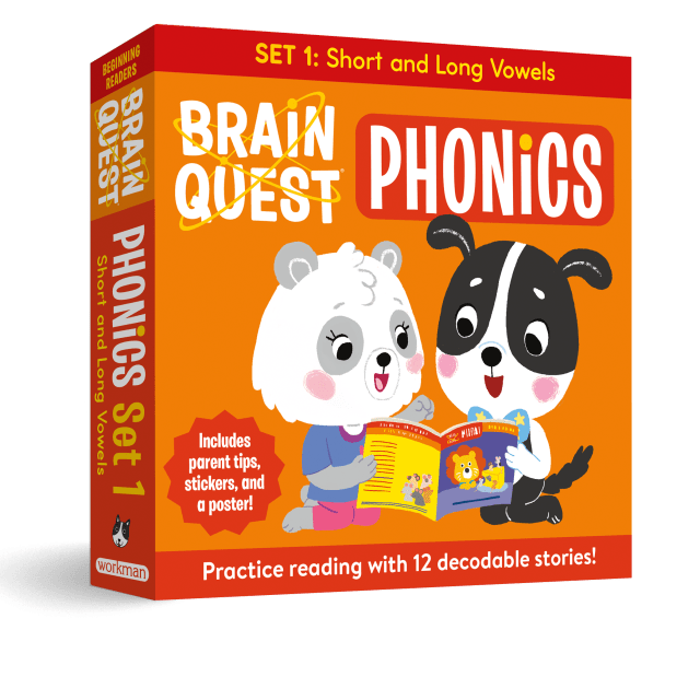 With cute art, silly stories, and simple text, Brain Quest Phonics Readers contain 12 adorable books written to help kids learn to read. Reviewed by a literacy expert, this box set contains decodable fiction and non-fiction books focused on two fundamental phonics skills: short and long vowel sounds. These fun, engaging stories feature familiar characters like the Brain Quest mascot Gizmo, Amanda the Panda, and Ryan the Lion, and build on the concepts introduced in the Brain Quest Phonics Workbooks (pub. May 2025). As with all Brain Quest products, children celebrate their literacy success with the included stickers and progress map. Parent notes at the beginning and end of each book provide targeted support for caregivers and teachers.